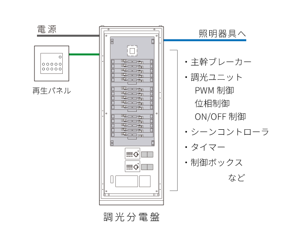 「調光分電盤」は照明装置を集約する盤。一定以上の規模の施設では、